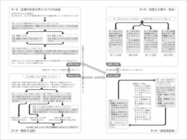 各章はそれぞれ四つのパートからなる。章の扉には問題関連図を置き、ベルクソンがどのような問題にどう取り組んだのかが一目で分かるようにした。次いで、著作の概要、学術的背景、キーワード解説の順に続く。